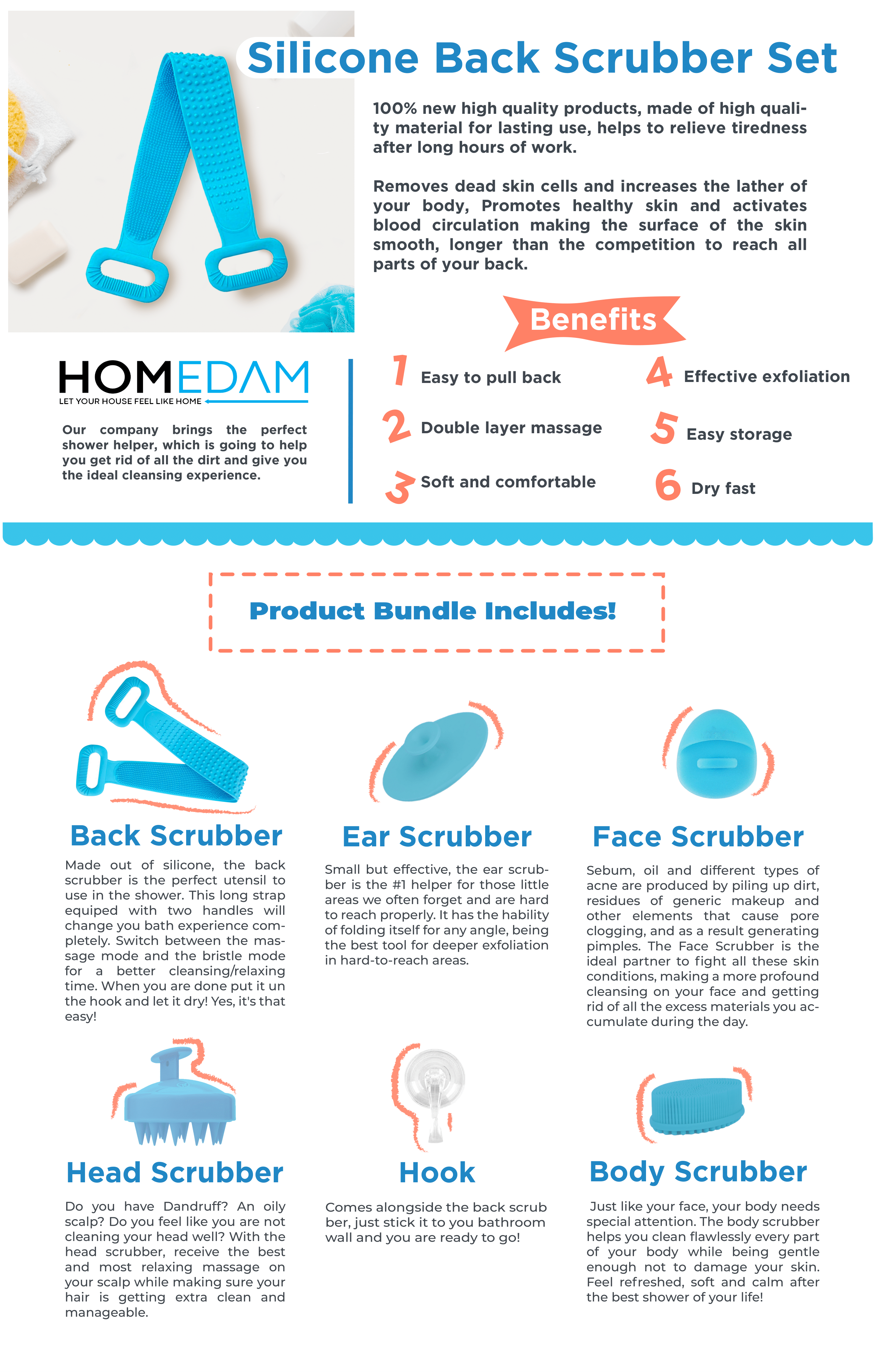 The product design and presentation for Homedam products revolved around functionality and aesthetic simplicity. By using clean, minimalistic designs in product images, the brand conveyed the practicality and value of the items. The listings were tailored to the modern consumer, focusing on high-quality materials, user-friendly features, and an appealing lifestyle-driven look. The visual identity was aligned with home decor and wellness trends, resonating with a wide audience.