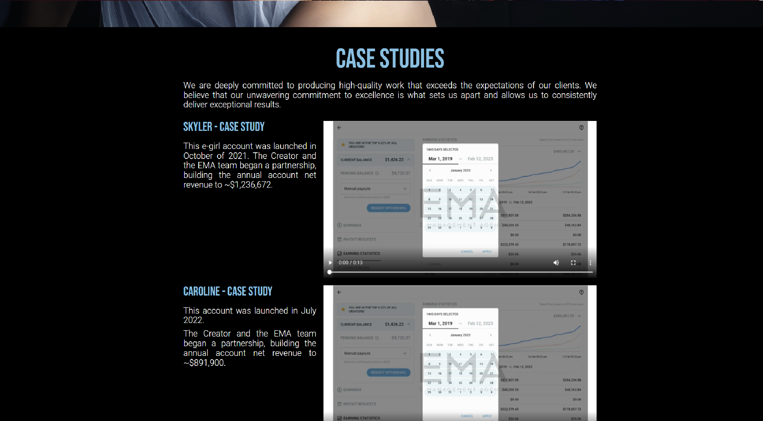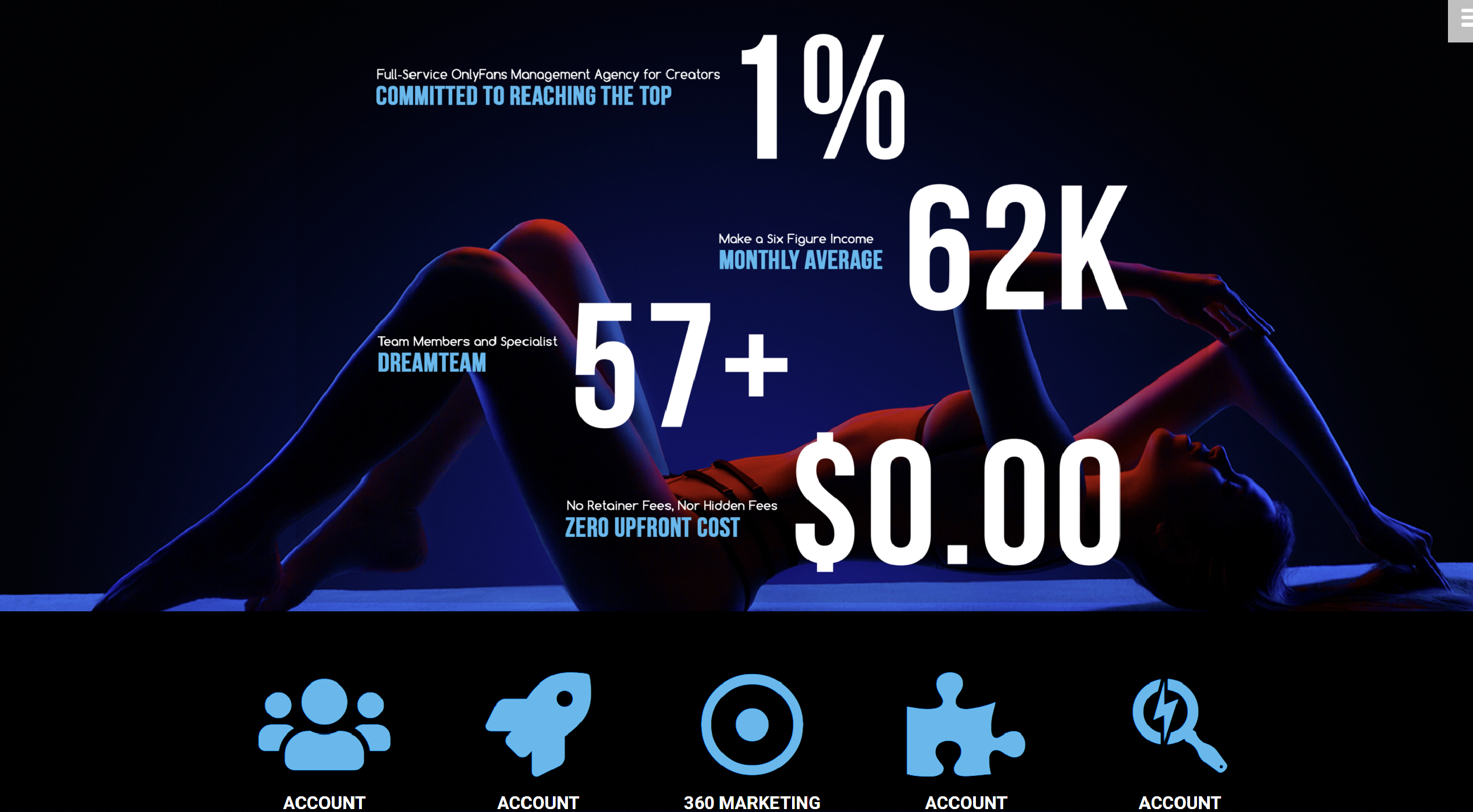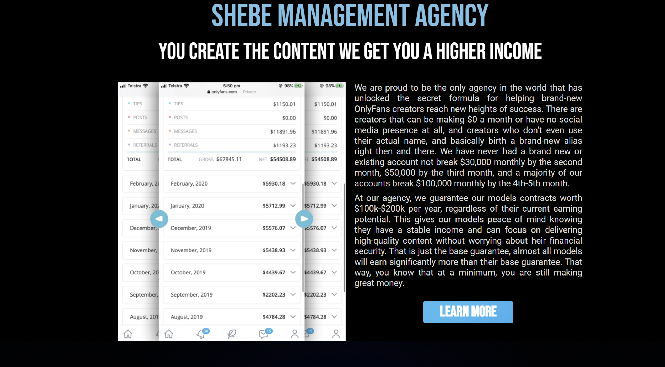 The main challenge was developing a platform that could accommodate multiple user profiles, ranging from models with little to no social media presence to well-established creators. The website needed to reflect the agency’s ability to grow accounts from scratch to surpass $100,000 in monthly revenue within 4-5 months.